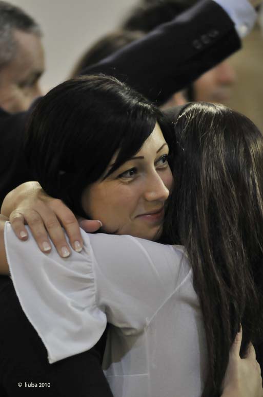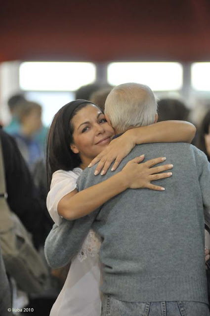 Ho cominciato ad ‘abbracciare’ alle 6.30 sino a più delle 9.30, avrò abbracciato centinaia e centinaia di persone. Il mio abbraccio era diretto, accogliente, guardavo dritto negli occhi e toccavo le persone, e quasi tutte hanno avuto reazioni di estrema gioia, di bisogno estremo di quell’affetto, molte sentivo che si rilassavano dentro stretta del mio corpo e delle mie braccia, moltissime si capiva che ne avevano un bisogno estremo e il loro corpo diventava improvvisamente vivo, gli occhi rilucevano, e la bocca sorrideva beata…