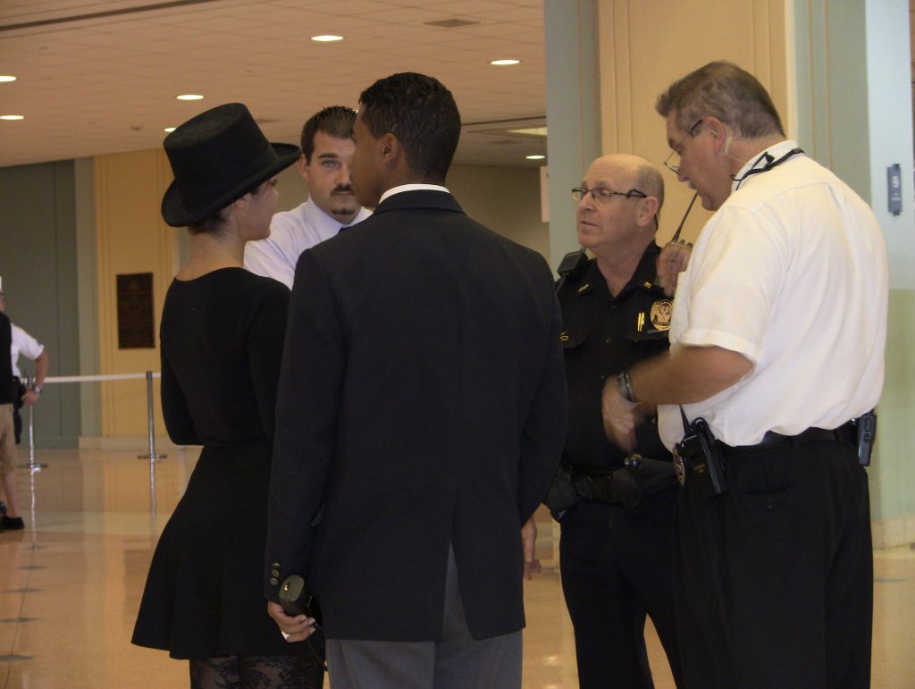 … Io gli dissi che era una performance … loro diventavano sempre più aggressivi, erano fuori di sè come se io fossi un attentatore con una bomba pronta ad esplodere addosso … C’era una guardia in particolare che mi guardava con due occhi pieni di odio, e diceva che voleva portarmi in prigione per quello che avevo osato fare … (vi rammento che mi hanno bloccato dopo circa un minuto).