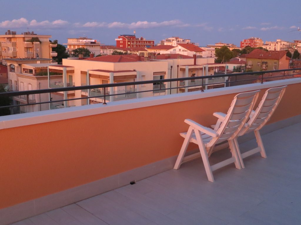 Sto scrivendo qui ora, sopra il letto della mia camera di Viserba, che dà sulla grande terrazza che dà sul mare. E’ come se la mia camera fosse all’aperto, ho il cielo davanti e sopra, ho una porta finestra gigantesca e la mia camera è come un rientro della terrazza. Sono fuori e dentro al tempo stesso.
