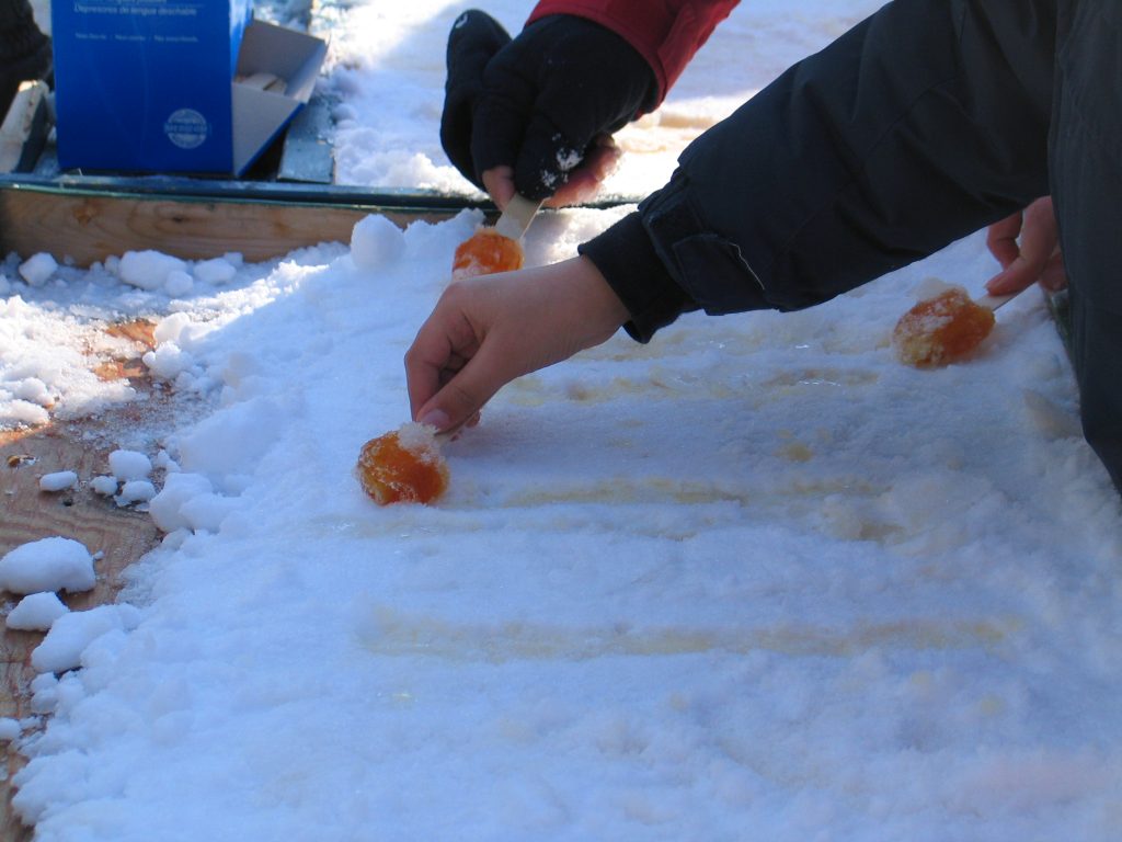 … Dulcis in fundo … (del nostro elenco, c’erano innumerevoli altri giochi e attrazioni) il famoso syrop d’erable, ossia lo sciroppo d’acero, la specialità Canadese: lo mettono bollente sopra la neve fresca e questo si coagula subito, tanto da poterne fare degli involtini con gli stecchetti per poi mangiarlo come un lecca lecca …