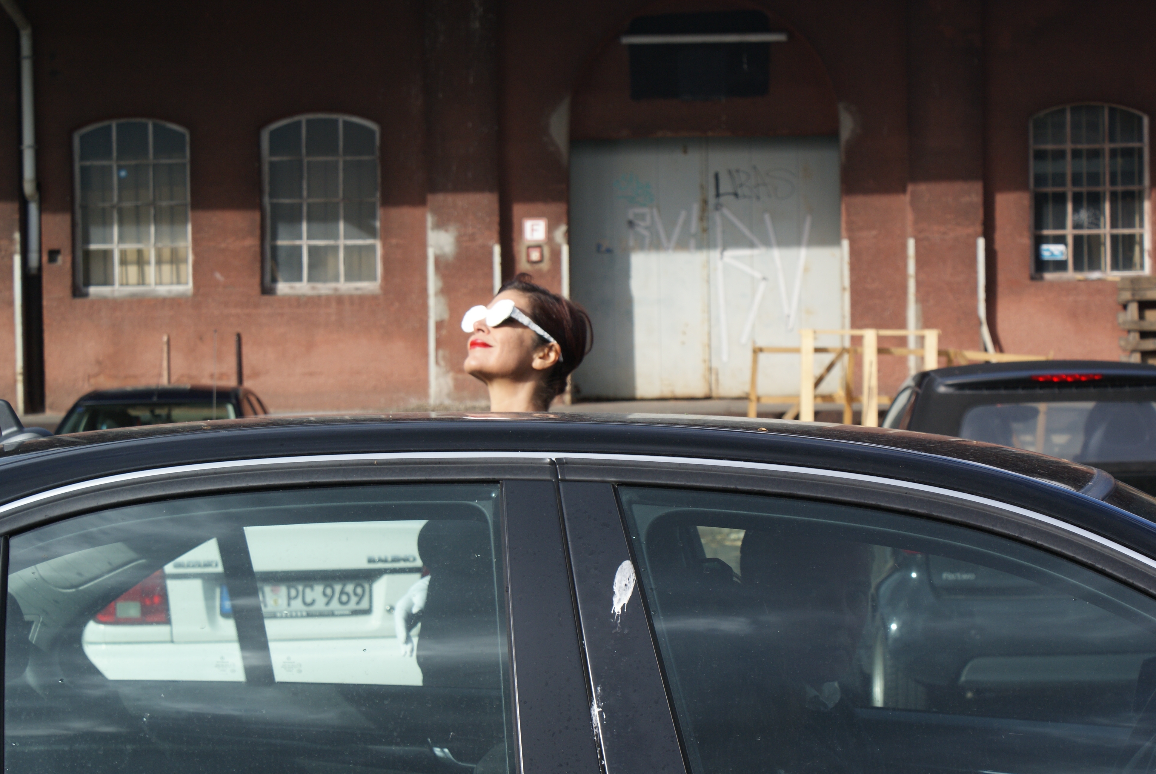In occasione della performance, infatti, il pubblico è stato invitato ad uscire dagli spazi della galleria e a percorrere le vie della città con gli occhi coperti da un paio di occhiali bianchi e coperti di stucco – realizzati a mano da LIUBA per oscurare la vista. I partecipanti hanno esplorato la città percorrendone strade, piazze e percorsi senza fidarsi dei loro occhi, ma trovando una nuova modalità di conoscenza ed esplorazione tramite il tatto, l’udito e la memoria dei gesti del loro corpo.