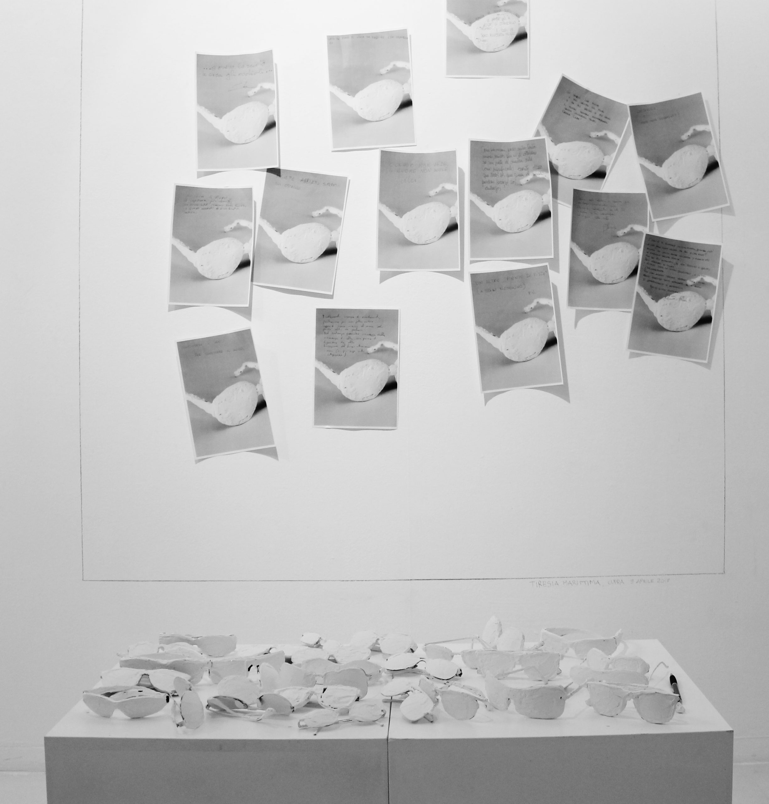 L’artista in questi oltre vent’anni di carriera continua ad affrontare nodi sociali, questioni antropologiche e spirituali con esiti estetici ed evocativi di grande suggestione e chiarezza, mostrando la ridondanza di certe dinamiche umane, con se stessi e nei gruppi, attraverso differenti linguaggi: nello spazio di Franco Marconi numerose stampe di riprese fotografiche e di still da video e installazioni che riguardano le sue performance, tracce di azioni solitarie e partecipate come infatti gli esiti di Tiresia Marittima; nonché quattro preziosissimi video: gli storici Il Cieco di Gerico del 2003 e I love to see the Armory del 2006, testimonianze delle relative performance alla Biennale di Venezia e al The Armory Show di New York, e i più recenti Refugees Welcome del 2013-2016 ricavato dalla performance al Kreuzberg Pavillon a Berlino (affiancato alla Letter to Refugees autografa del 2013 con cui l’artista coinvolgeva i rifugiati invitandoli a raggiungerla in galleria) e You’re Out del 2014-2016, tratto anche questo dalla serie dedicata al tema dell’esclusione/re-inclusione. Tra gli altri, esposti anche gli oggetti che compongono lo stage di With No Time #1 e #2 del 2015-2016, come il tappeto sul quale i partecipanti sono chiamati a stare in piedi con le palpebre chiuse e in silenzio per 12 minuti, stipati uno accanto all’altro, sconosciuti tra loro, tanto quanto i migranti nello spazio della barca in cui sono costretti a viaggiare.