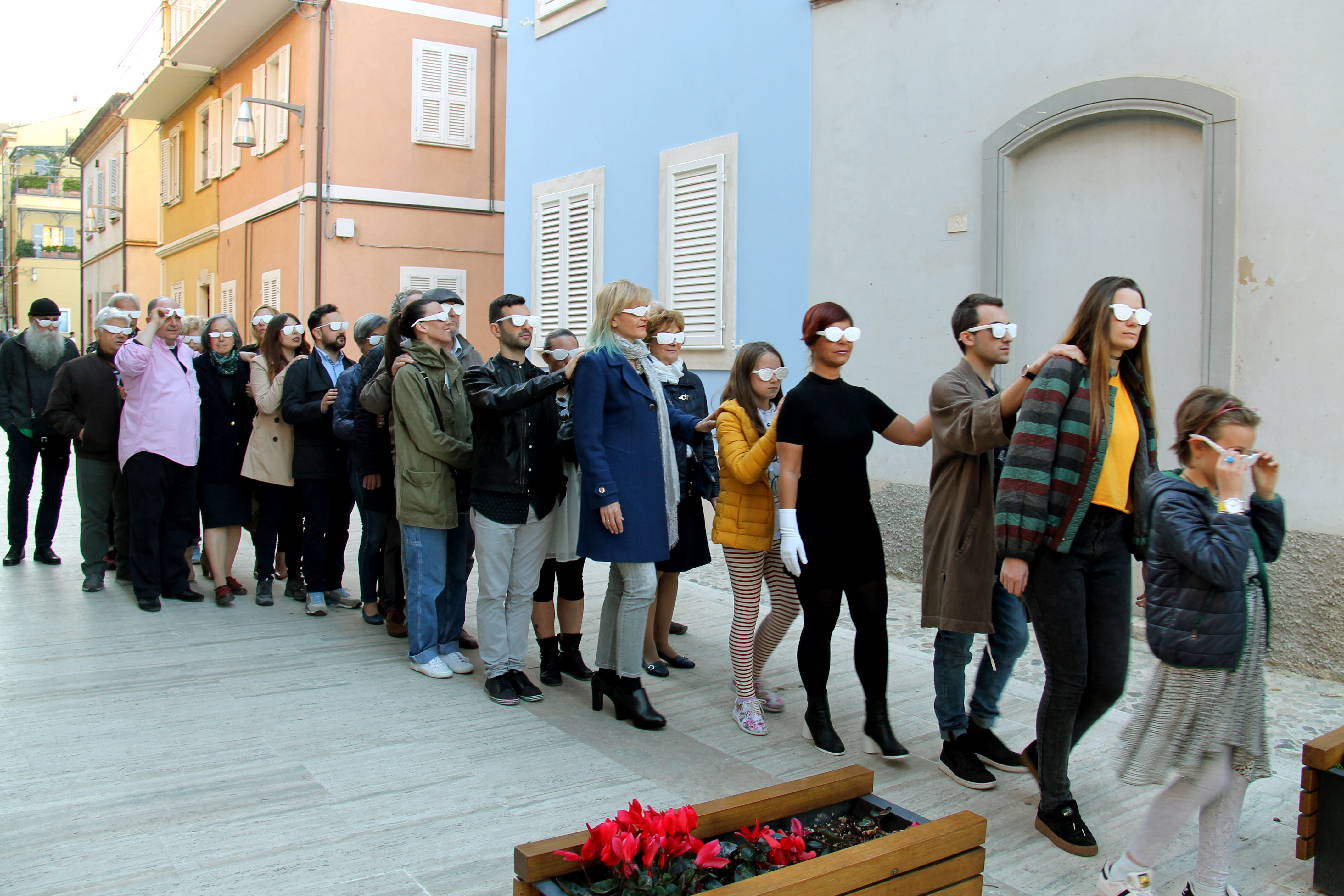 Indossare degli occhiali totalmente oscurati muovendoci per il nostro paese, Cupra, è stato un invito da parte dell’artista a prendere coscienza della nostra cecità.