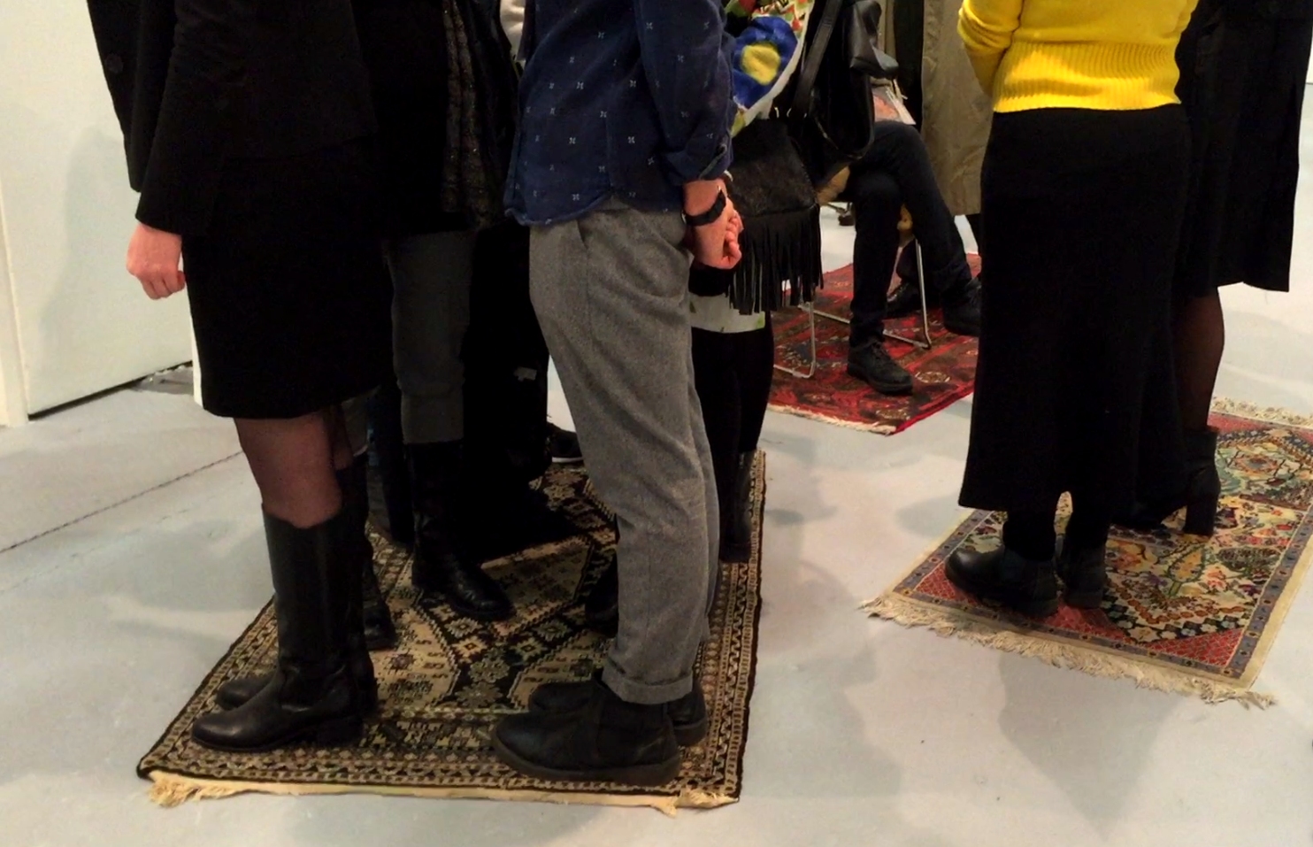 Sono queste le stesse condizioni che vivono gli spettatori che, dopo la proiezione del video Refugees Welcome, vengono stipati su dei piccoli tappeti, che costituiscono ideologicamente lo spazio della barca nella quale i migranti sono costretti a viaggiare. Il limite del tappeto è invalicabile.