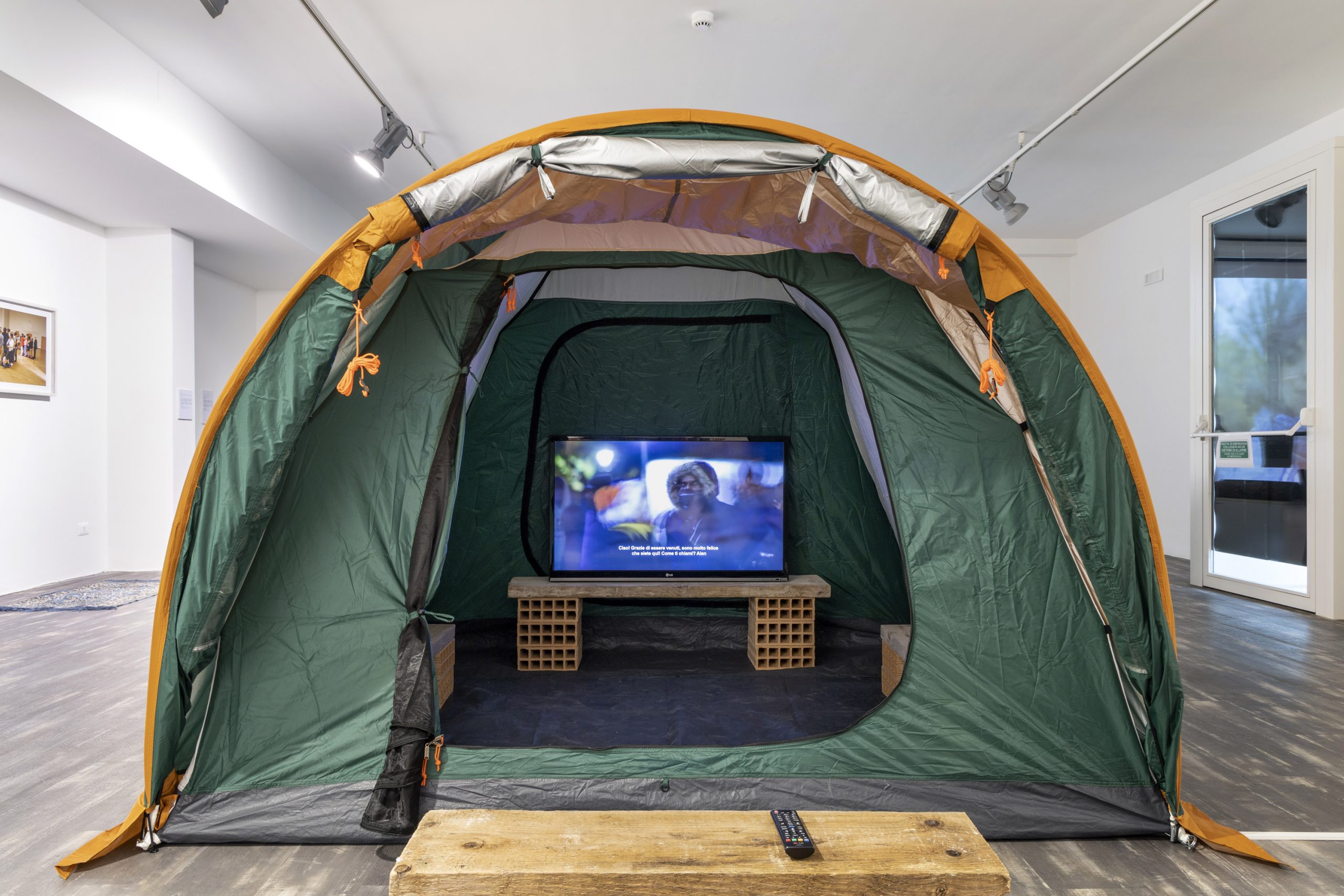 Refugees Welcome, videoinstallazione, tenda per rifugiati, video, monitor, assi di legno, mattoni, 2013-2019 photo credits Cosmo Laera, Fondazione Pino Pascali, Polignano a Mare (Ba), 2019