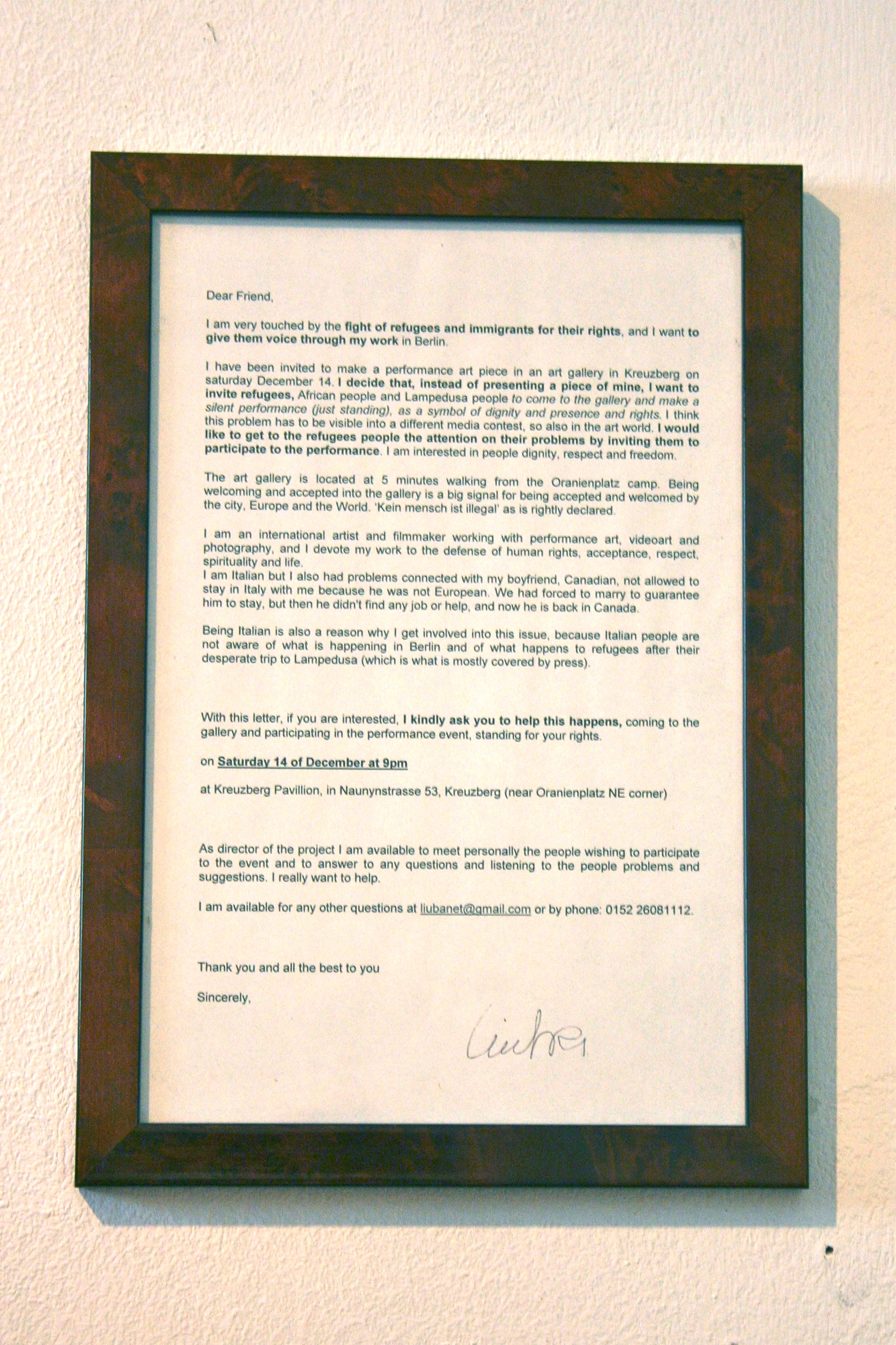When I was invited to present a performance art piece at the Kreuzberg Pavillon, I realized that I was not interested in presenting a work of mine nor in speaking about myself. I wanted instead to give voice and space to the Refugees people and their problems. I was aware that the media, at least in Italy, gave distorted information on the whole issue.
